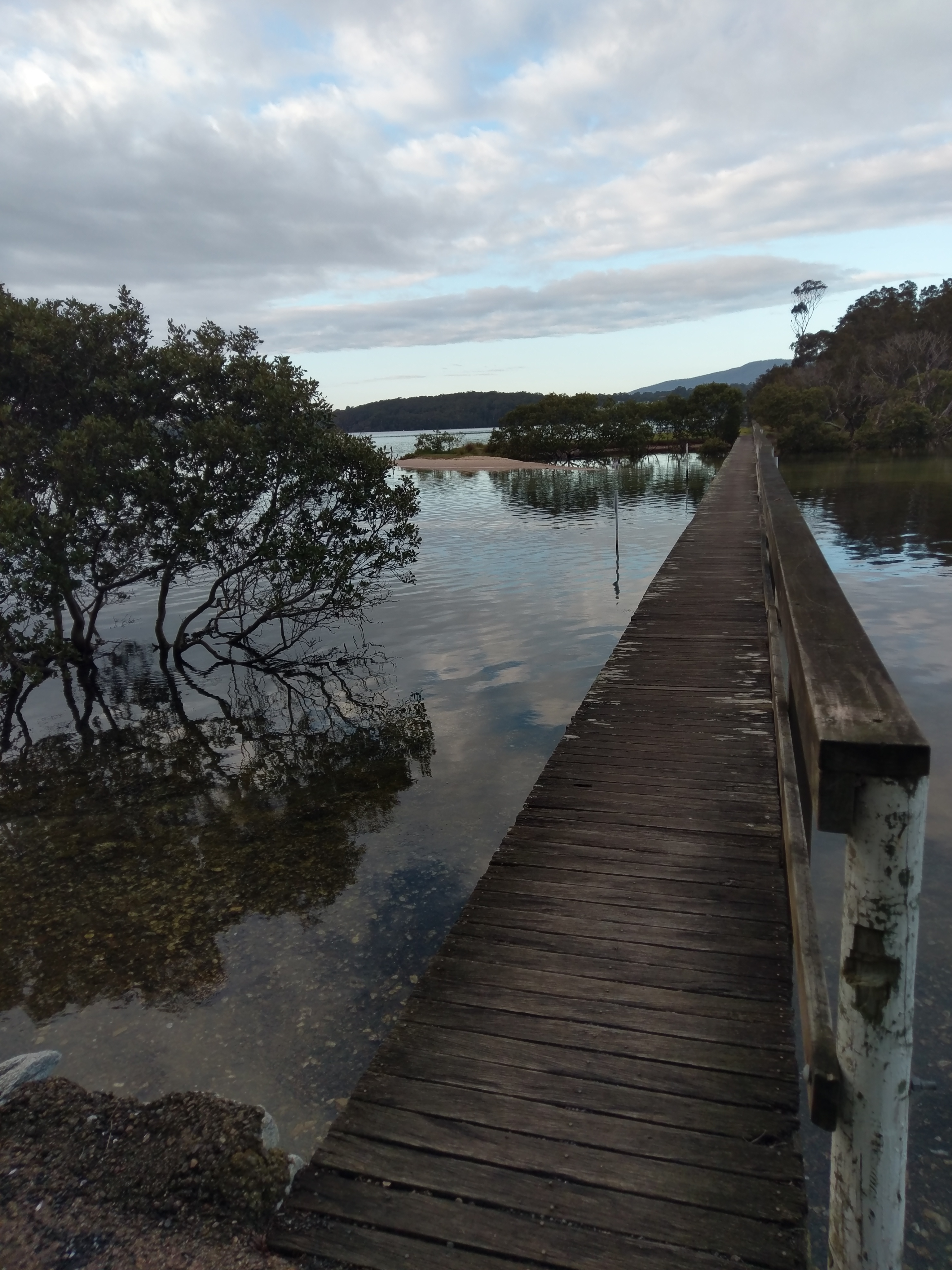 We spent a good part of Tuesday 12th Feb driving south from Currarong down along past Ulladulla and Batemans Bay to Narooma. It’s no rumour that it’s a marvellous (that my over used superlative for this post), place and that’s the truth. It was blowing like the billy-ohs on the drive and we stopped at Mogo, a super quaint little village on the way through and had a coffee and cake, (we didn’t budget for stops like this and the bill adds up really quickly—If you want to sponsor us please send us the details and we’ll send you our account number). we arrived later than we would’ve normally and found that this van park was a wee bit squishy. The first indication of this was the tiny narrow parking bay in the reception area where you stop to sort the details out. After we were given our toilet keys and gate codes I started taking off for our site, but the van had a strange reluctance to move on. I thought it was just a little bump or something. No. It was the steps tearing away at the log retaining wall. Both parties came away from this fight bruised and bleeding. It turned out to be fatal for the steps and I had to surgically remove them with some grunting and groaning and finally, a hacksaw. All whilst laying down on the ground (undignified and back twinging). I made some calls and I can replace them reasonably cheaply when we get to Melbourne as the New Age birthing place (I’m talking about caravan manufacture not a bunch of people chanting and burning herbs around a screaming woman who is trying to have a baby) is in that vicinity.