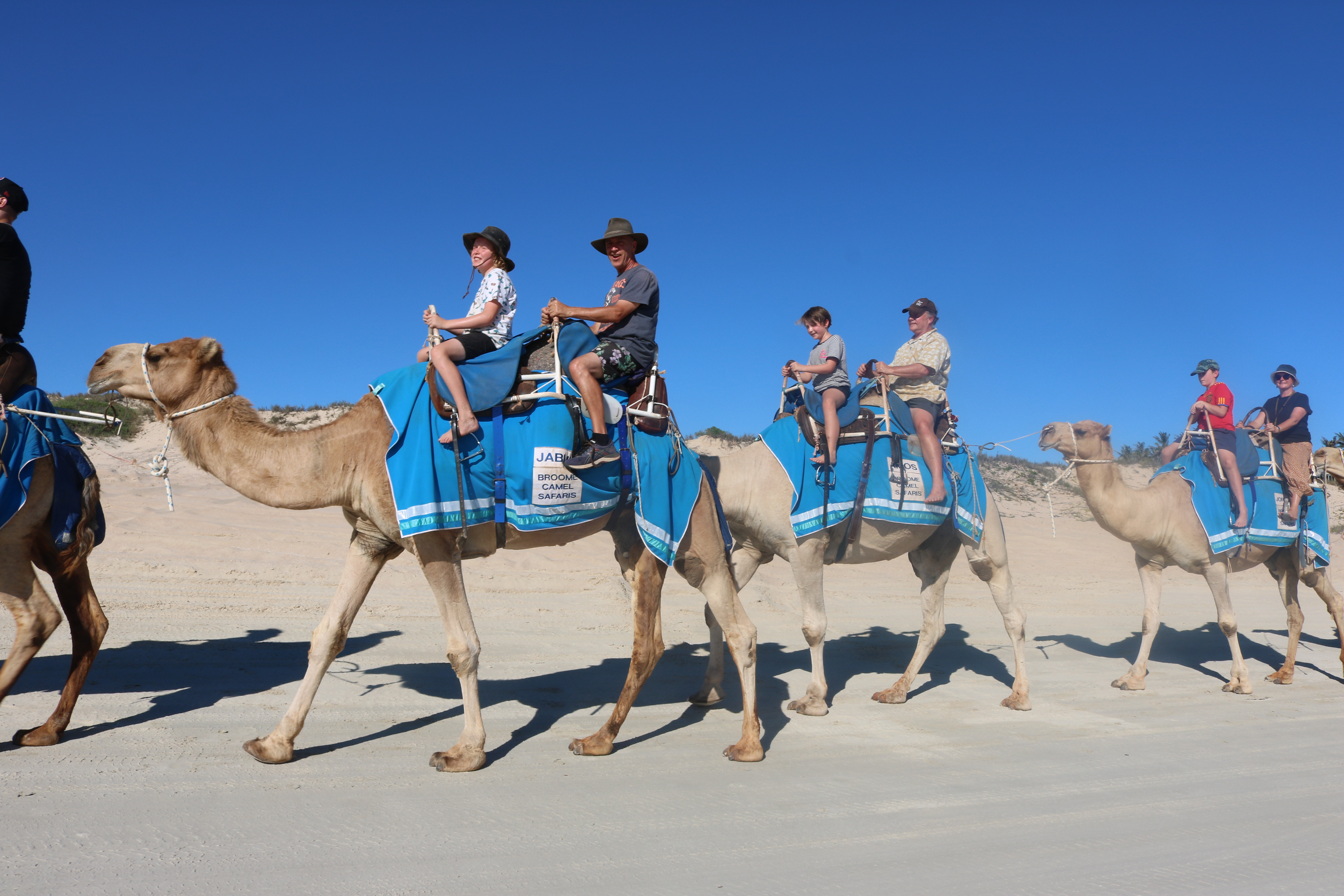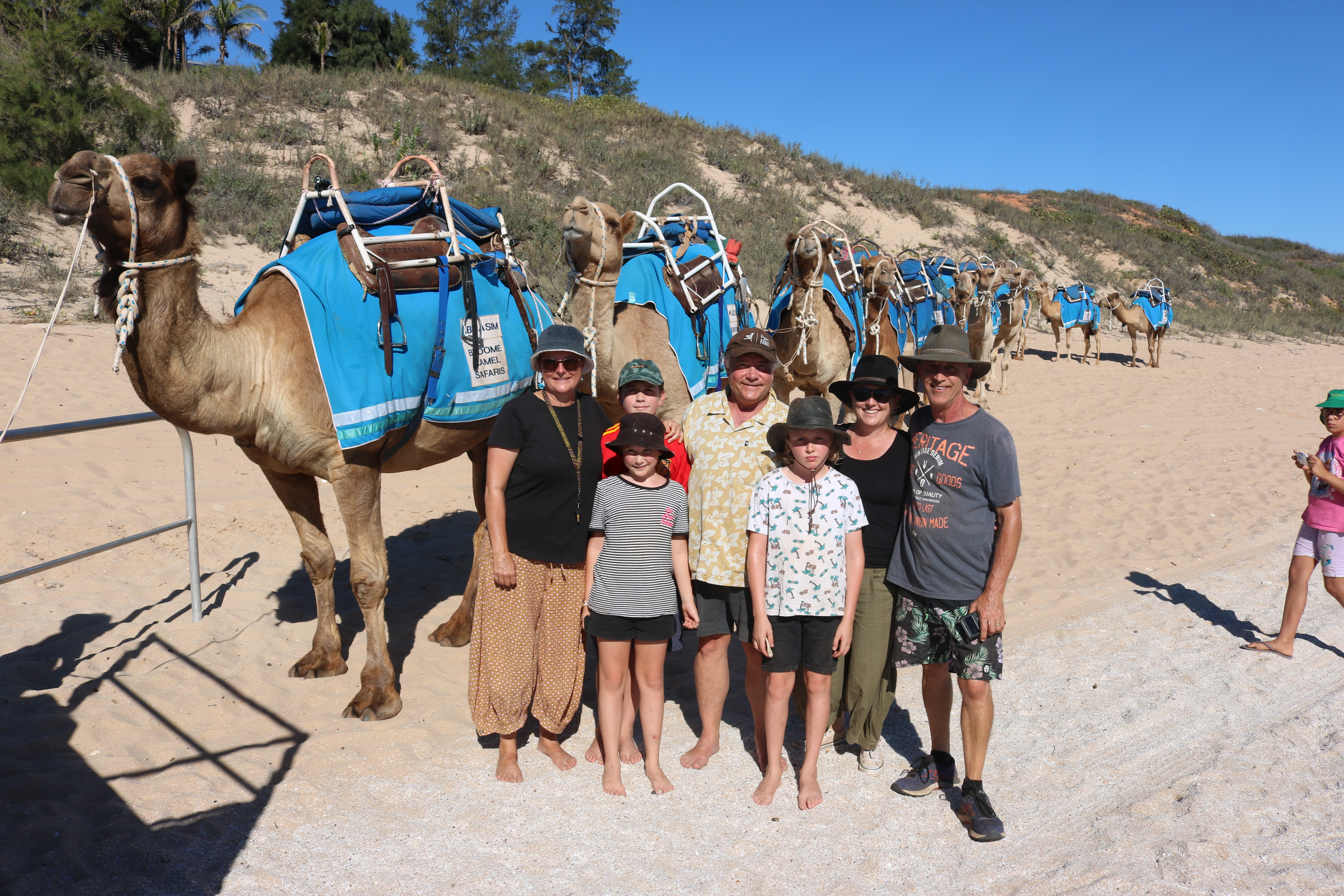 Our site was okay except for these rowdy, obnoxious neighbours……….. Ha ha Pete and Ange did I get you! We were on a tiny site but because it was just next to our shiny new friends Pete and Ange, it was much more bearable as we set up our table on their site (lucky them) and generally harassed them. Kids were very happy to have Fin to hang out with. We went on a tag team camel ride the first afternoon which was a hump we had to get over. They were dromedary flavour with blue sashes (the camels that is). I was on one called Amos with Lou. It was very high up and more swingy than a belly dancer’s hips but we managed to stay on and have a good time.